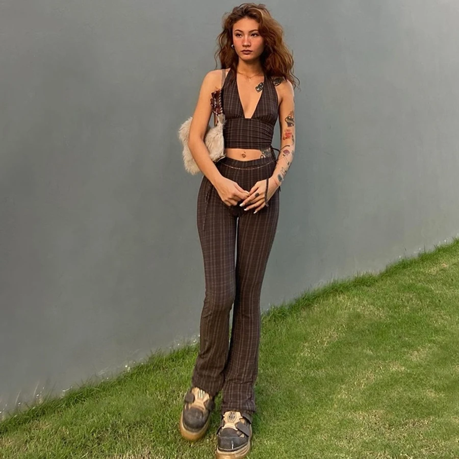 Name: E-girl-camisola a rayas con cuello en V para mujer, Pantalones rectos de cintura alta, ropa de calle elegante, pantalones largos ajustados, Y2K, Primavera